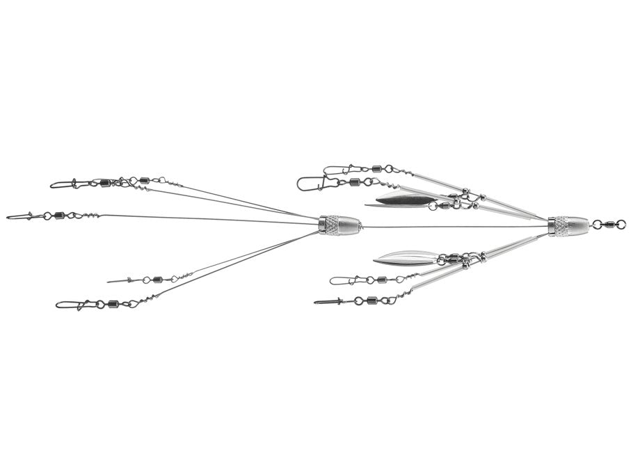 An incredibly efficient twist on a proven productive tool, the Shane's Baits Blades of Glory Umbrella Rig is smartly crafted to ensure unparalleled performance season after season. The Blades of Glory Rig is led by a military grade aluminum head that is turned on the most precise Swiss machines to ensure impeccable balance while still allowing wiggle room for the stainless steel arms to maximize their longevity. That meticulous head is crowned with a buttery smooth swivel that offers the same supreme strength and durability as the snap swivel combinations hanging on the end of the wire arms.
